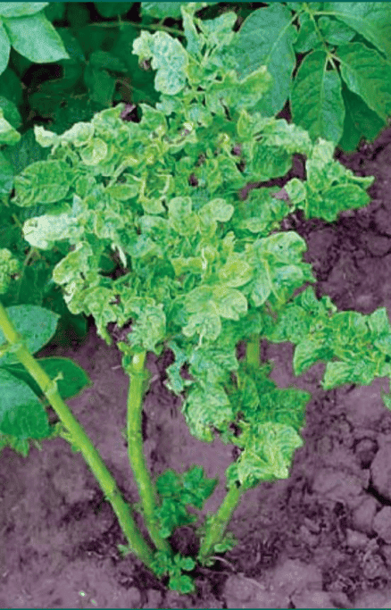 Неравномерность окраски листьев. Деформирование листьев – вздутия межжилковой ткани. Гофрированность листовой пластинки, загибание листьев картофеля вниз. Позднее эти признаки усиливаются. Листья сначала светлеют, затем становятся желтоватыми или сероватыми. При первичной посадке заражённых вирусами клубней заболевание проявляется медленнее. Сначала появляются крапчатость или мозаика на верхних листьях, затем листья деформируются, на них появляются некрозы. При более позднем заражении (последующий год воспроизводства растений) симптомы заболевания совсем не проявляются и обнаруживаются только в следующих репродукциях.